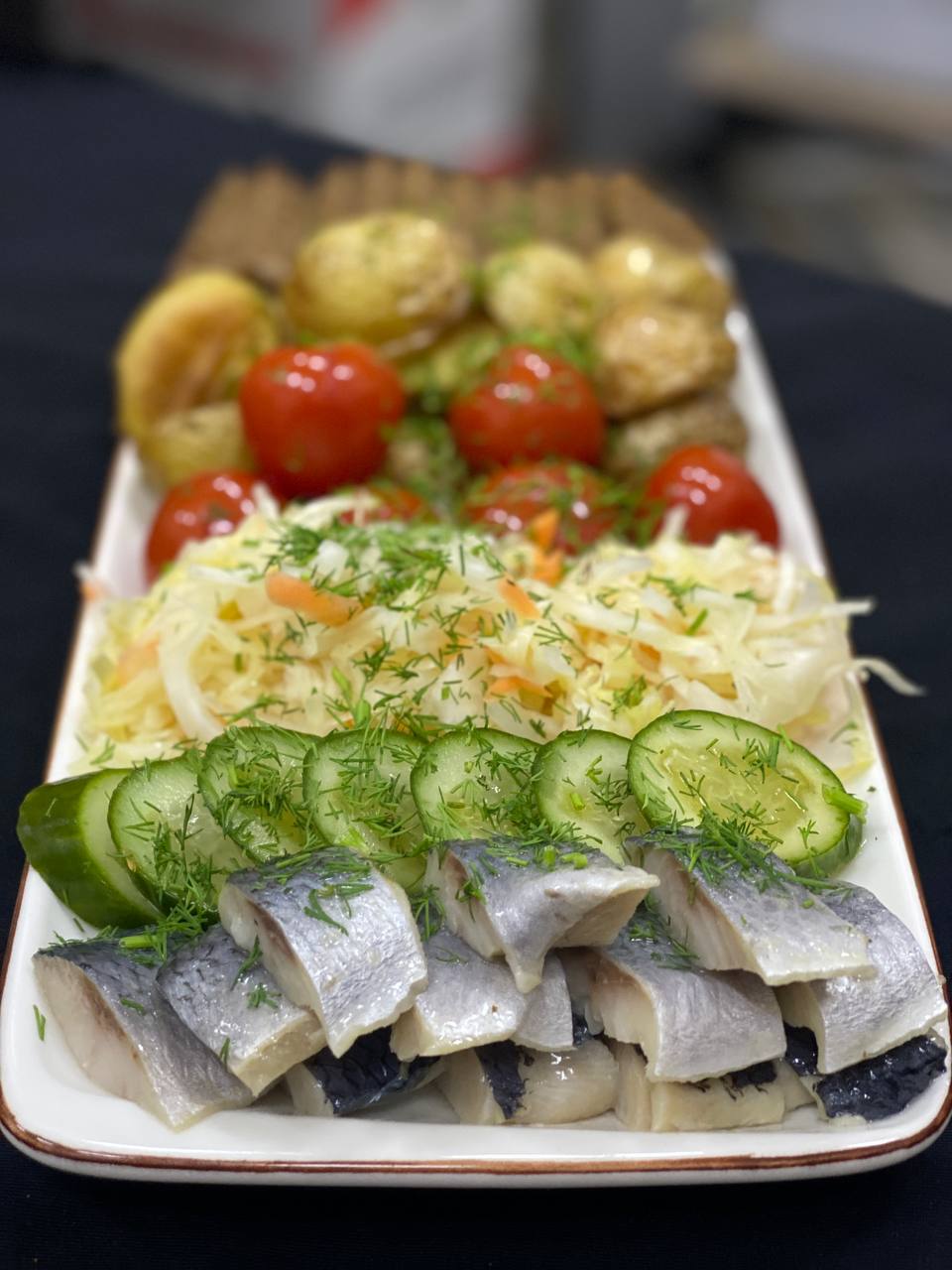 Малосольные огурчики, квашеная капуста, селедочка, маринованные черри, запеченый картофель, маринованый лучок. Идеально к водочке. Fırında mini patates, turşu balığı, turşu salatalık ve domates, turşu soğan, lahana turşusu