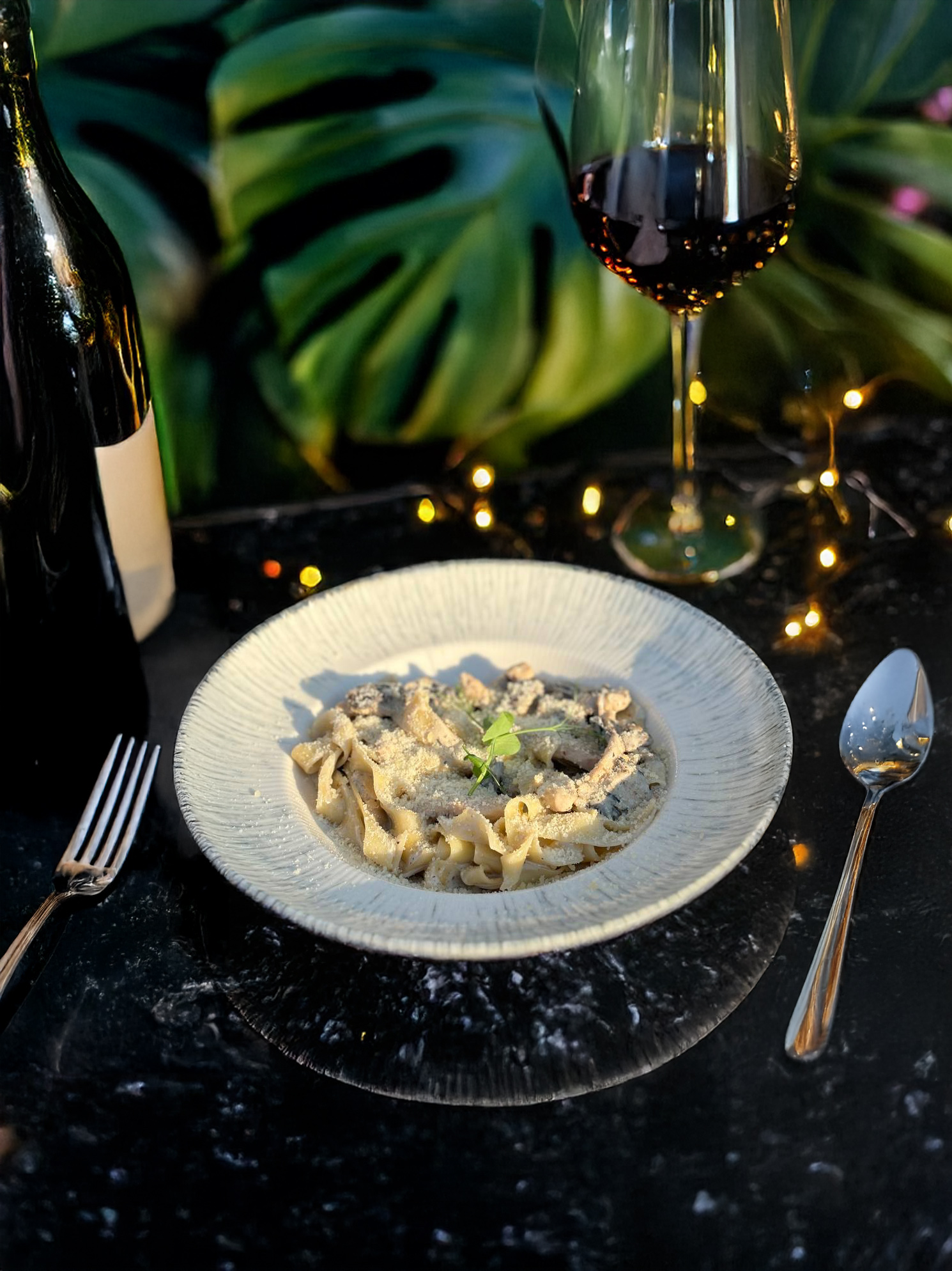Куриное филе с шампиньонами и фетучини, обжареные в кунжутном масле, с добавлением соевого соуса и сливок. Подается с сыром пармезан.