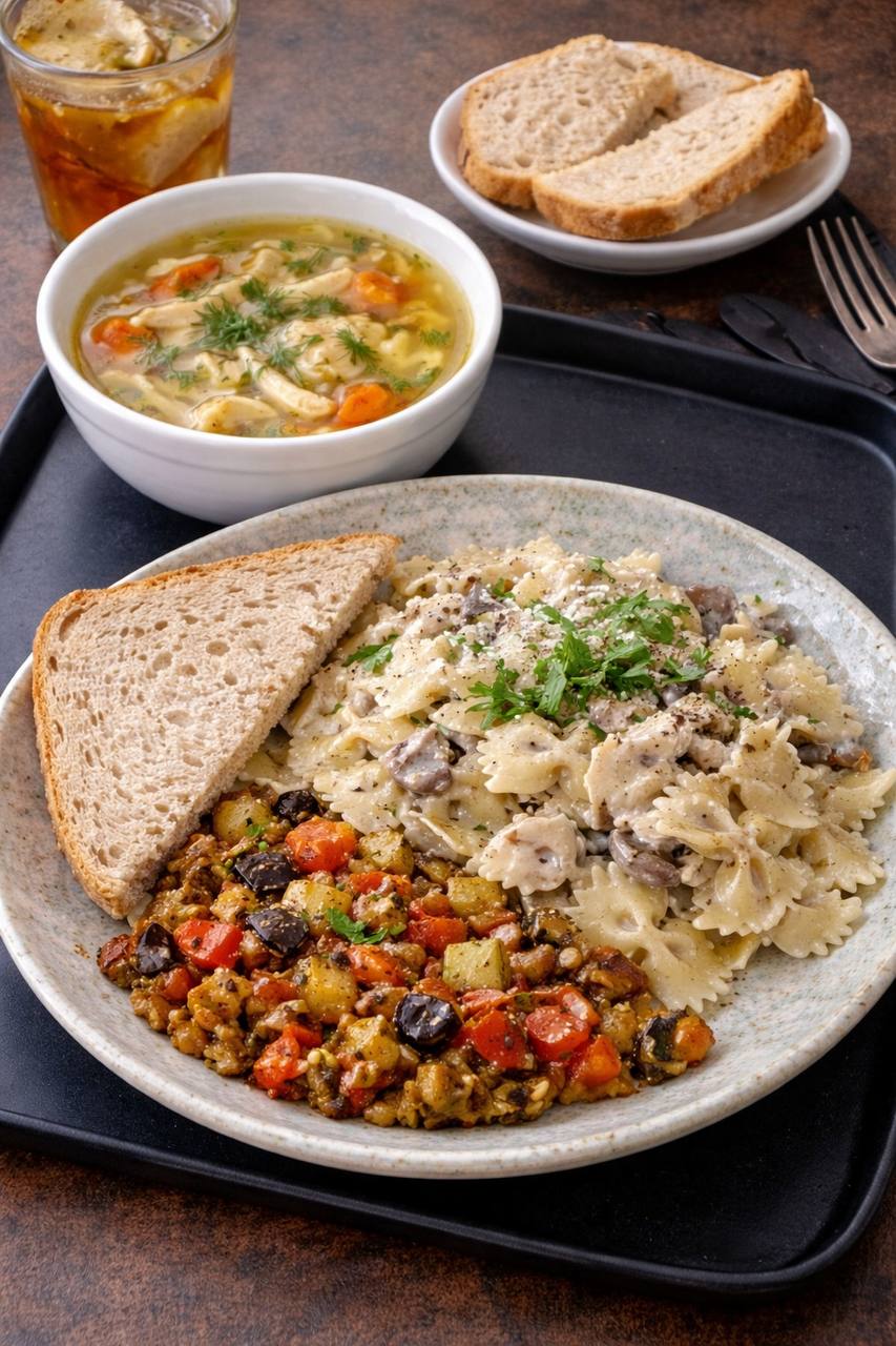 tavuk çorbası kremalı soslu tavuk ve makarna salata sebze