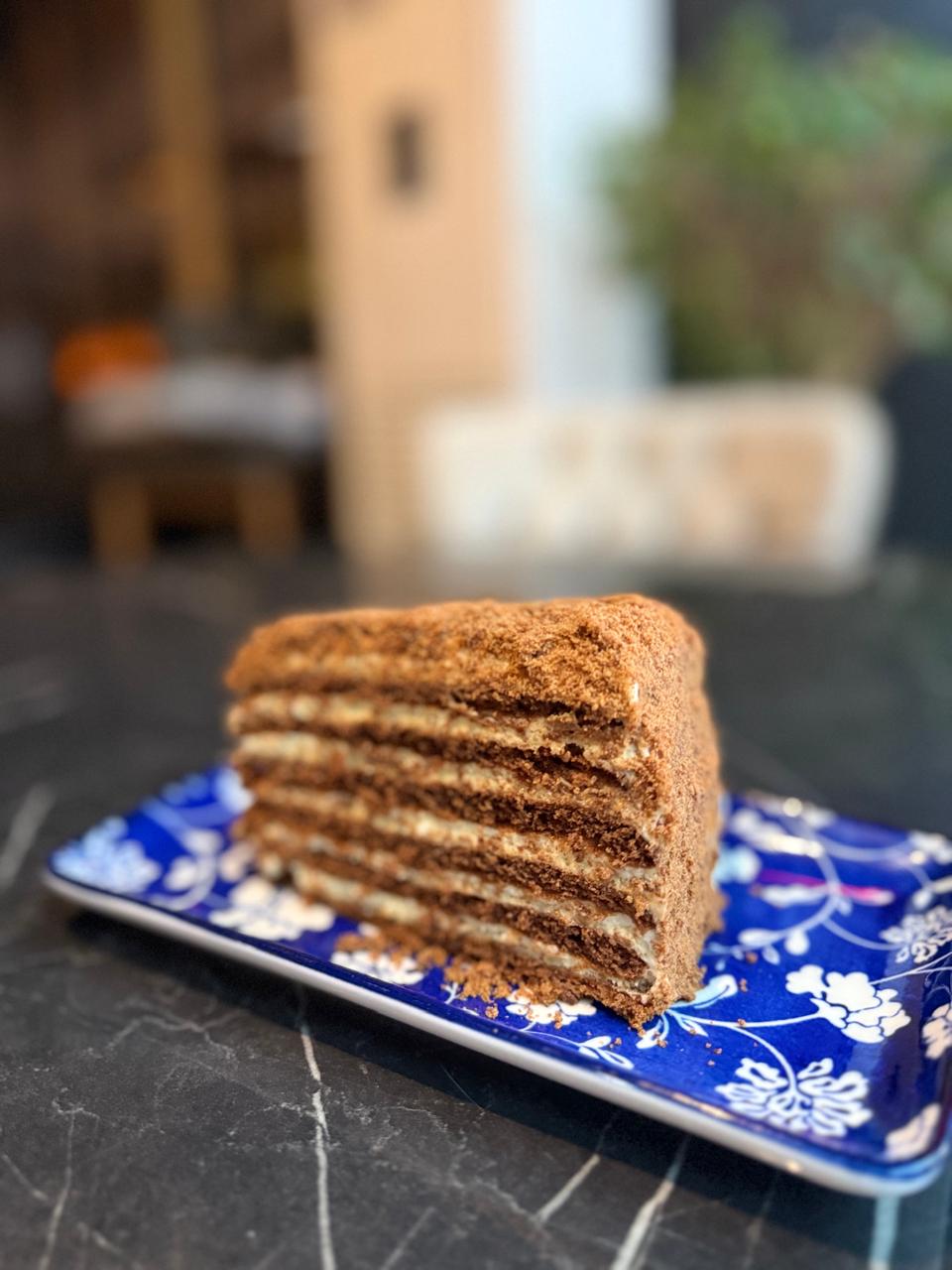 Медовик с шоколадным послевкусием и кремовым удовлетворением. Çikolata aromalı ve kremsi tada sahip ballı kek.