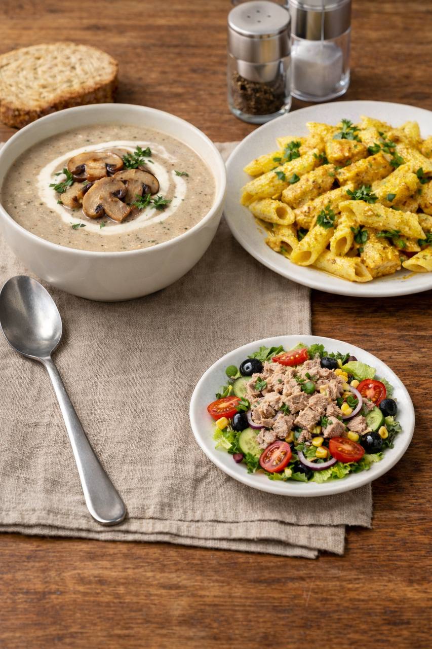 mantar kremalı çorba ton balik salatasi makarna ve cori tavuk