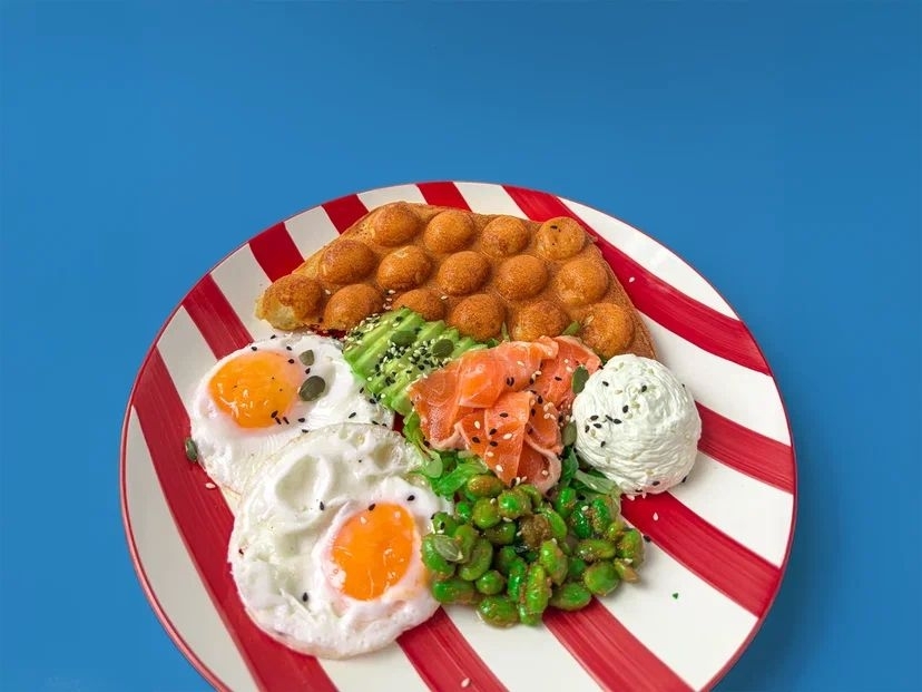 Глазунья, лосось, гонконгская вафля, бобы эдамаме, авокадо, листья салата, огурец, соус чиз