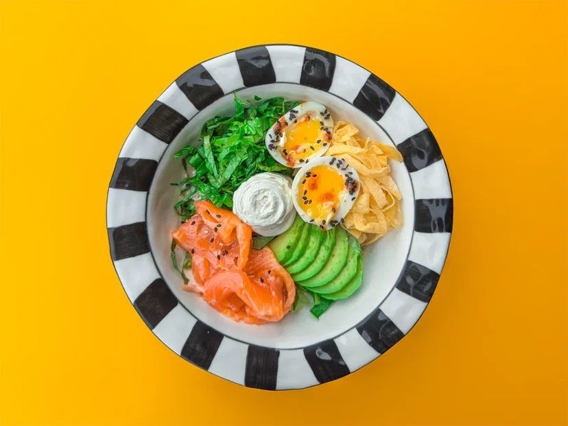 лосось, омлет тамаго, авокадо, листья салата, яйца, соус чиз, соус кунжутный