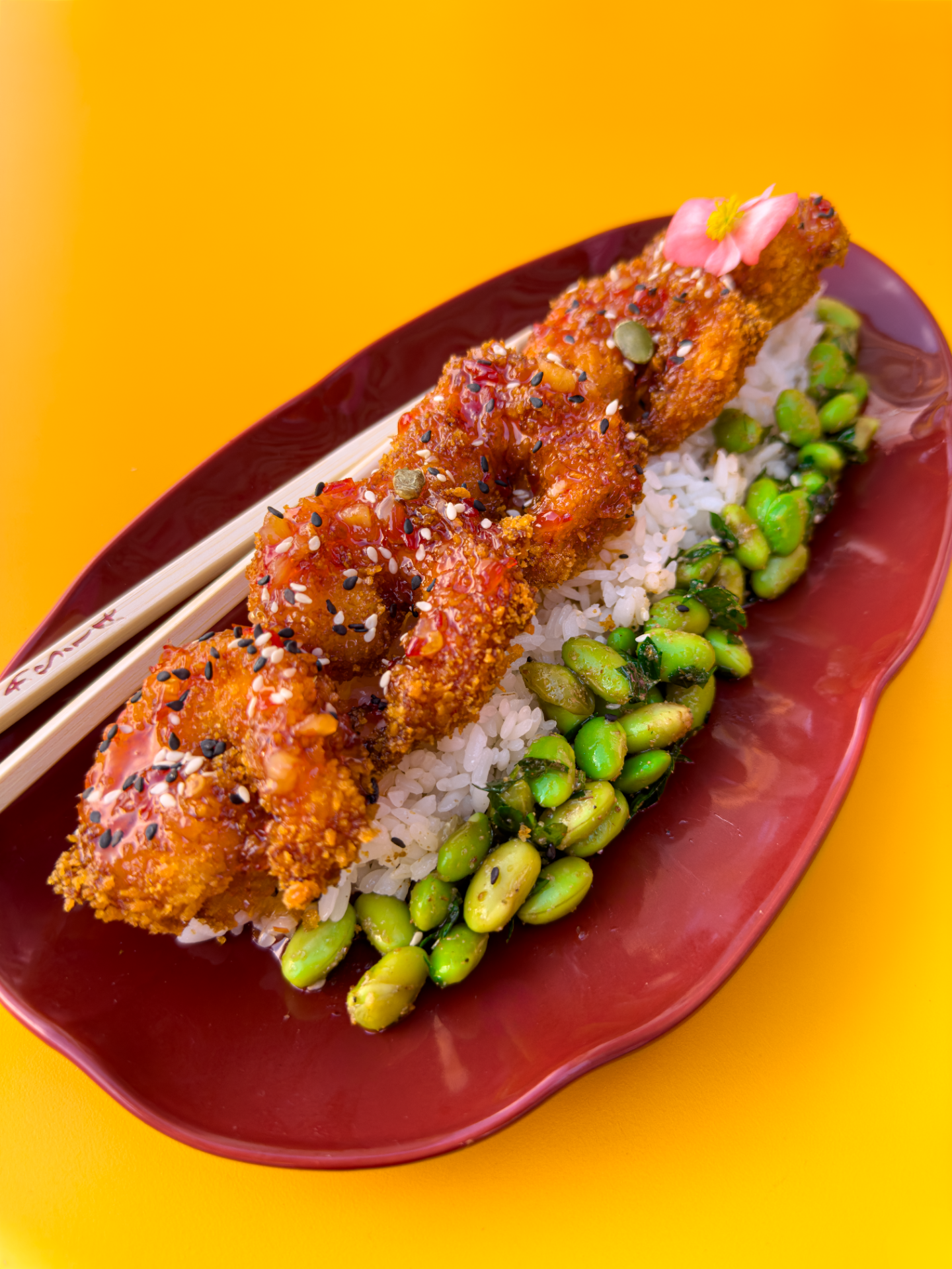 Креветки темпура с рисом и эдамаме