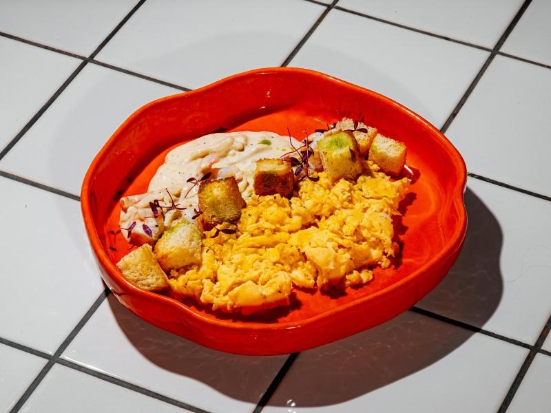 Яйца, сливки, тигровые креветки, кальмар, гренки-бриошь, сливочное масло