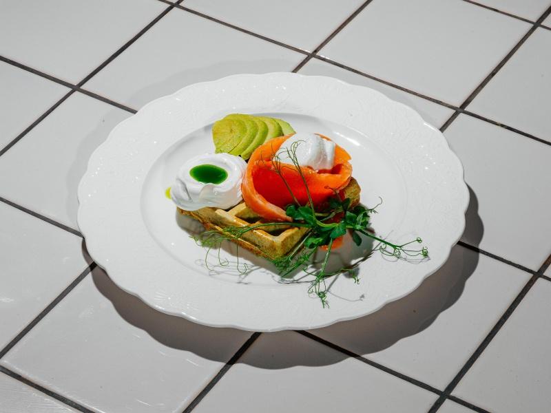 Вафля из кабачка и шпината, лосось в апельсиновом соусе, авокадо, сливки, творожный сыр, яйцо пашот
