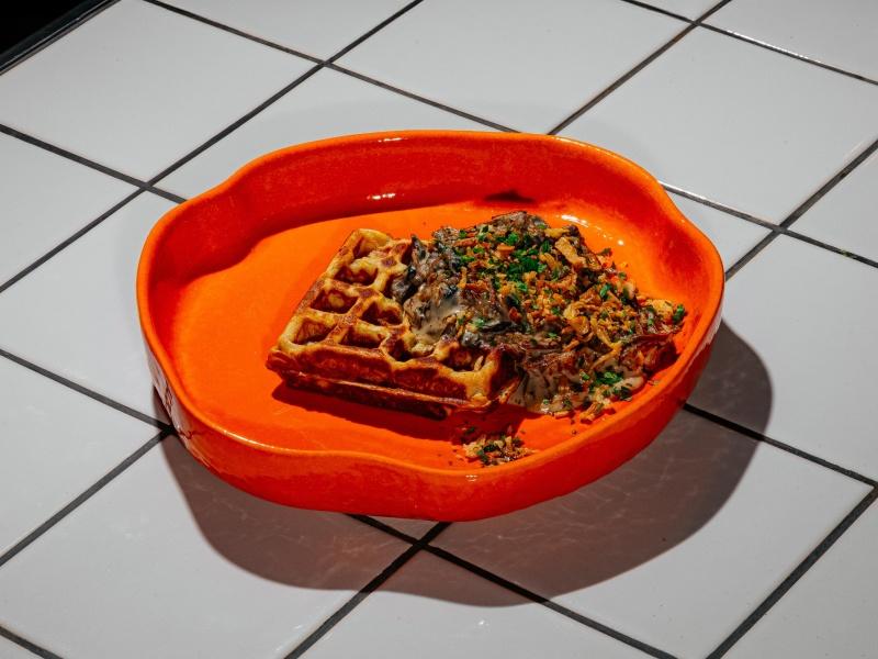Картофельная вафля, томлёная говядина, шампиньоны, сливки, хрустящий лук, микрозелень