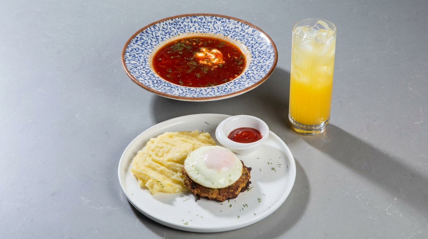 Борщ московский с говядиной: Классический рецепт 1956 года. Подаётся со сметаной. Бифштекс с яйцом и картофельным пюре: Готовим из 100% говяжьего фарша и репчатого лука. Подается с яичницей глазуньей и картофельным пюре.