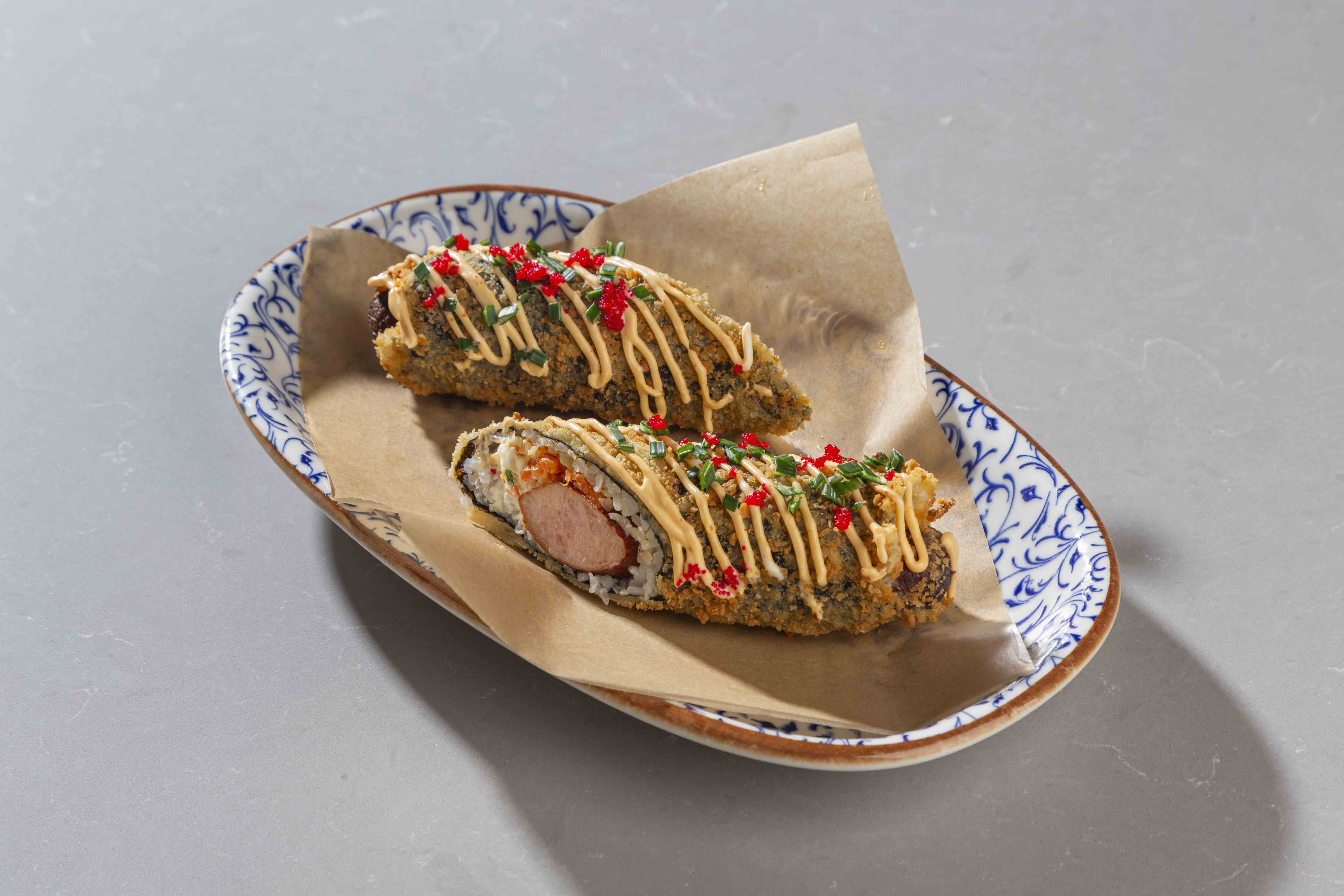 Классический хот дог японо - американского стрит-фуда. Хот дог в панировке, с начинкой из творожного сыра и и пикантной моркови, Куриная сосиска и спайси- соус. Декорируется луком-порей и икрой масаго.