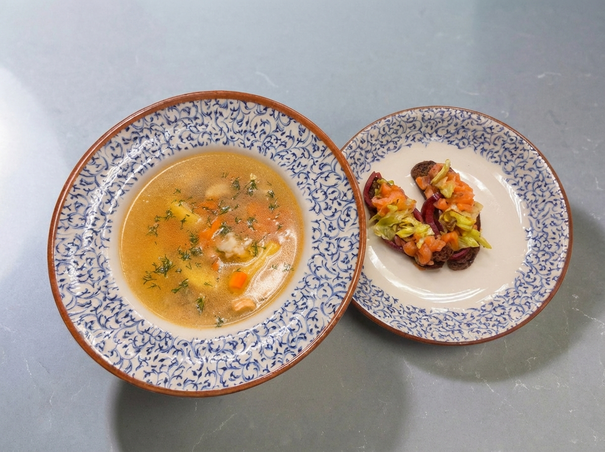 Ароматная и аппетитная уха из трески, лосося и овощей. К ухе подаём пару тостов ржаного хлеба с лососем слабой соли и маринованного лука.