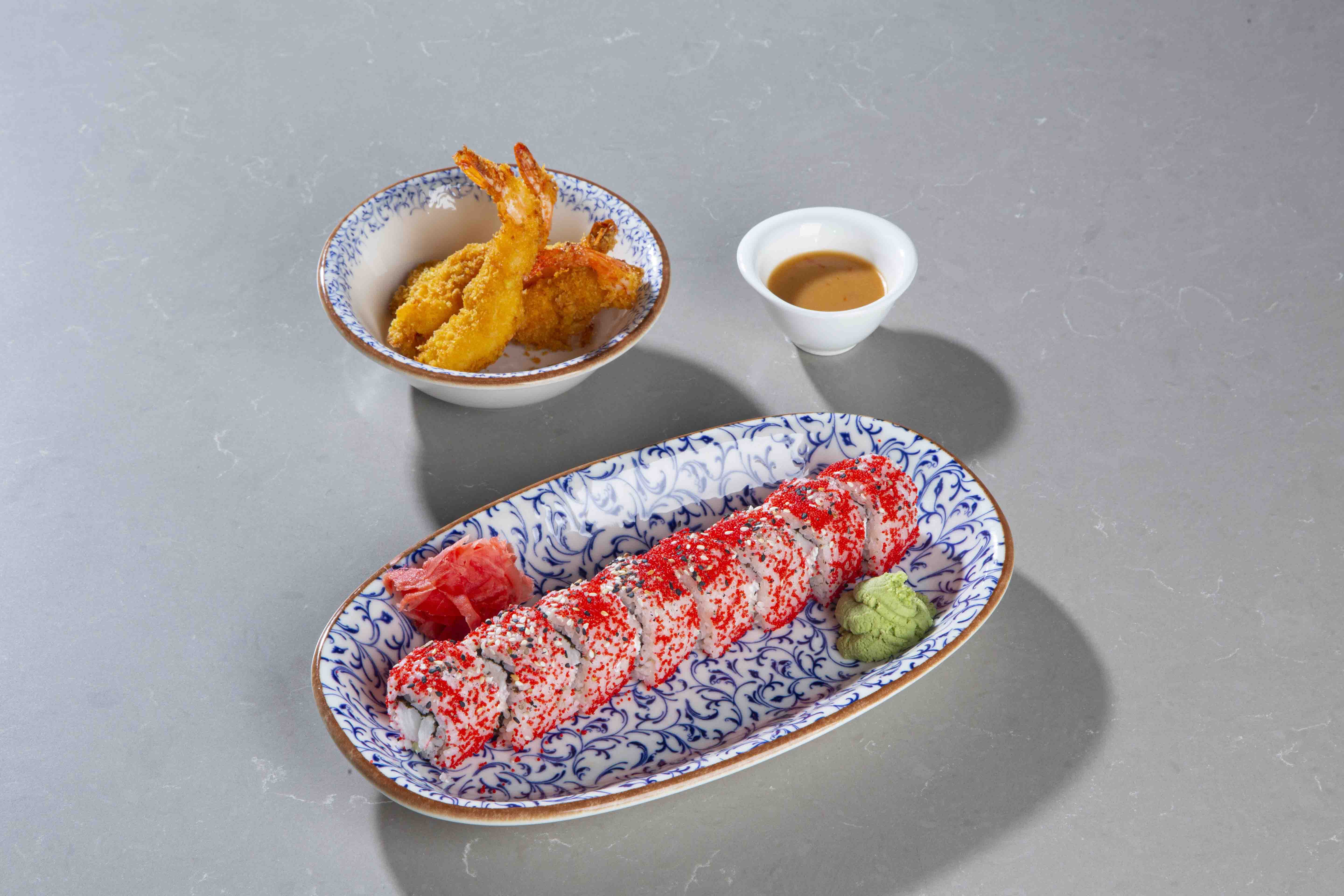 Ролл «Калифорния» и креветки в темпуре – отличное сочетание для ценителей японской кухни: мягкие свежие роллы и хрустящие креветки образуют гармоничный дуэт с ярким вкусом и контрастной текстурой.