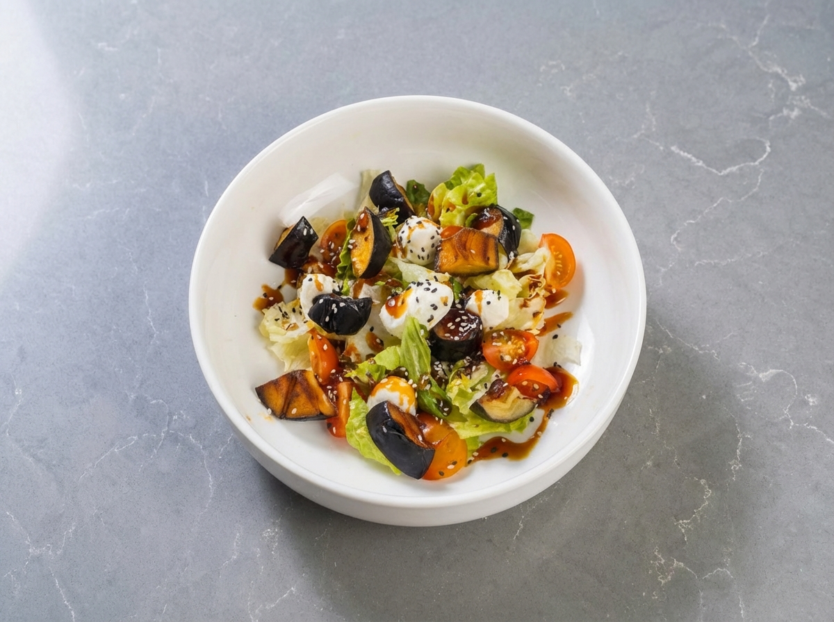 Хрустящие баклажаны, томаты черри, творожный сыр и свежие листья салата. Заправка на основе соуса унаги и сладкого Чили. Декорируется кунжутом.