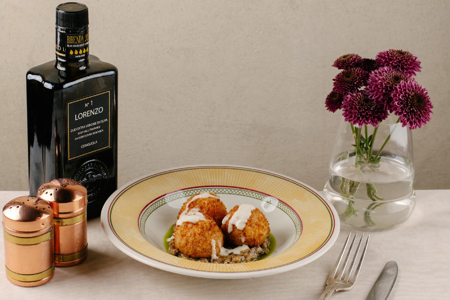Горячая закуска из двух шариков аранчини. Хрустящие итальянские аранчини с фермерской тягучей моцареллой, сливочным соусом и густой икрой из сезонных грибов
