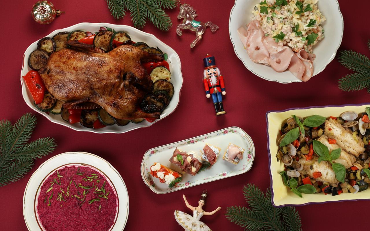 -- Запеченная фермерская утка в соусе хойсин с апельсинами, цукини и баклажанами - Треска "Аква пацца" - Оливье с мортаделлой - Сельдь под шубой с анчоусами - Мильфей с коппой - Мильфей с мортаделлой - Овощная брускетта - Брускетта с видело-тоннато *Уточняйте стоимость блюд при бронировании мероприятия
