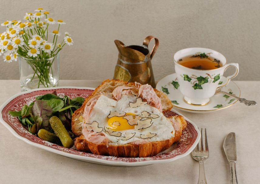 Воздушный круассан на новозеландском сливочном масле с трюфельным соусом бешамель, итальянской мортаделлой, пармезаном 36-месяцев, глазуньей и черным осенним трюфелем Уньчинатум. Подаем круассан с хрустящим салатом и маринованными корнишонами