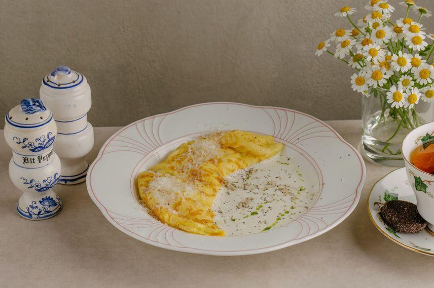 Воздушный омлет с домашней рикоттой, которую мы готовим с добавлением трюфельной пасты, подаем омлет с муссом из пармезана 36 месяцев, свежим тертым бургундским трюфелем Уньчинатум и базиликовым маслом