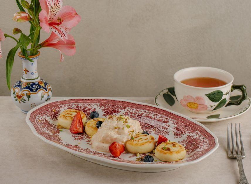 Нежные ароматные беби-сырники мы подаем с воздушным кремом из вареной сгущенки и сливок, свежими ягодами и карамелизированной фисташкой