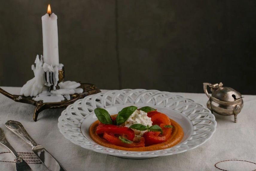 Пряный и воздушный крем из болгарского перца, слайсы запечённого перца, страчателла, базилик и оливковое масло.