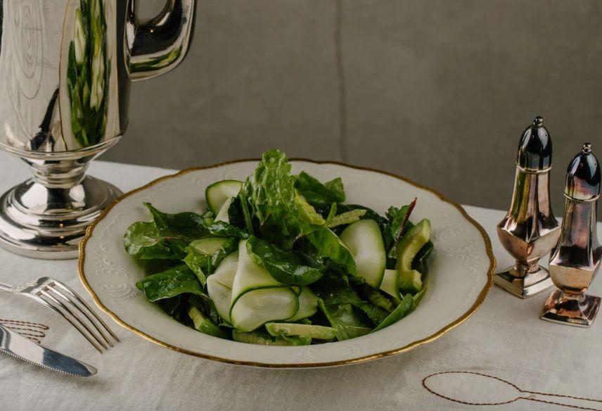 -Сезонные хрустящие салаты — романо, пакчой, шпинат. Подаем с авокадо, вяленными томатами, маринованными лентами цукини. Яркого вкуса добиваемся тремя соусами: шпинатным на основе эстрагона и петрушки, апельсиновым на основе апельсинового фреша, меда и горчицы и классическим на основе белого винного уксуса и лимонного масла. Три вида зелени и три вида заправки сделали этот салат любимым обедом Мадонны!
