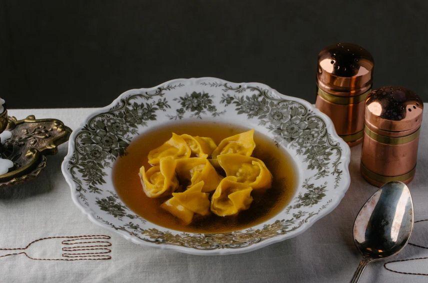 Крепкий бульон на фермерской курице, домашние тортеллини с рубленной утиной ножкой, маскарпоне и пармиджано. Суп, которым вы точно наедитесь!