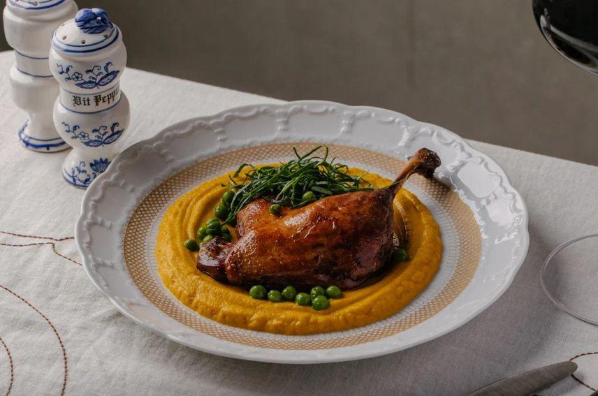 -Блюдо, которое выглядит, как произведение искусства! Утиный окорочок, просоленный с цедрой апельсина, мы готовим в соусе хойсин при низких температурах. Дополнение к утиному мясу — морковное пюре с бадьяном, тимьяном и экстрактом ванили, сливочным маслом, луком и чесноком. Украшаем шпинатом, свежим горошком и жареной фисташкой.
