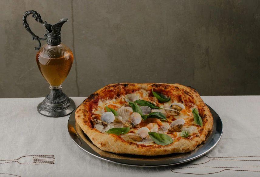 Домашнее тесто, томатный соус из томатов, чеснока и орегано, смесь отборных креветок, кальмаров и вонголе в створках. Морепродукты мы готовим в соли, перце и лимонном масле. Дополняем кусочками моцареллы и базиликом.