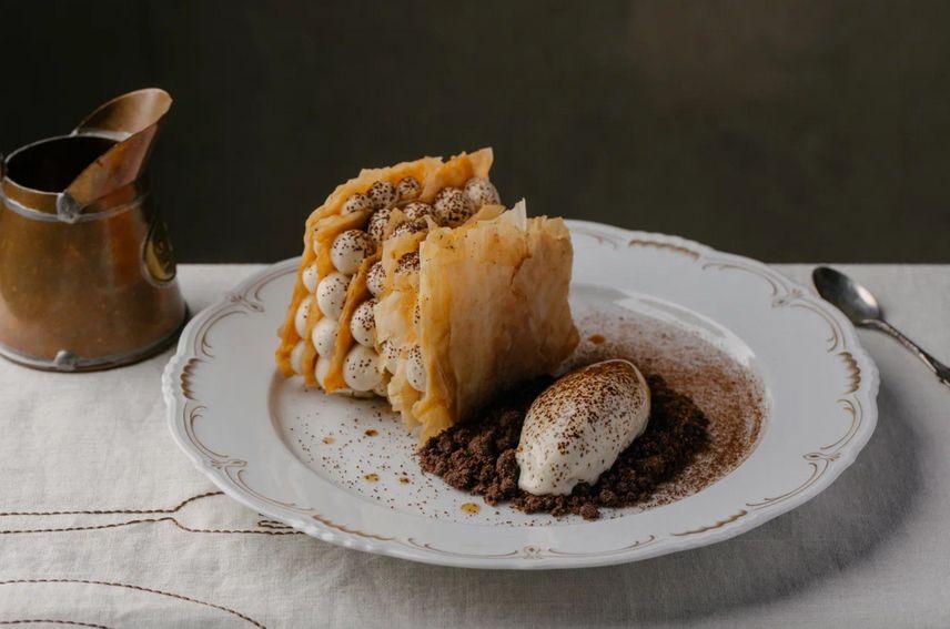 Тончайшее карамелизированное тесто фило и крем с добавлением эссенции из домашнего яблочного сидра. Подаем с домашним ванильным мороженым, шоколадным крамблом и цикорием. Рекомендуем с рюмочкой лимончелло!