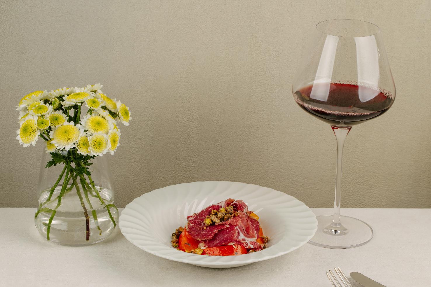 Сочетание, которое сложно представить, не попробовав. Прошутто прямого импорта, мягкая хурма, маринованная в бальзамике и молотом фенхеле и фермерская сливочная страчателла.