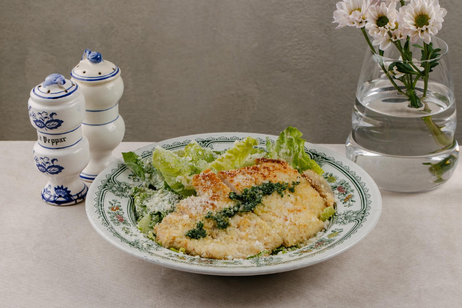 Хрустящий салат романо, шницель по-милански из филе грудки фермерского цыпленка, соус цезарь на основе анчоусов, соуса ворчестер и пармезана. Дополняем салат гремолатой из сочной зелени и оливкового масла, а также пармиджано выдержки 36 месяцев.