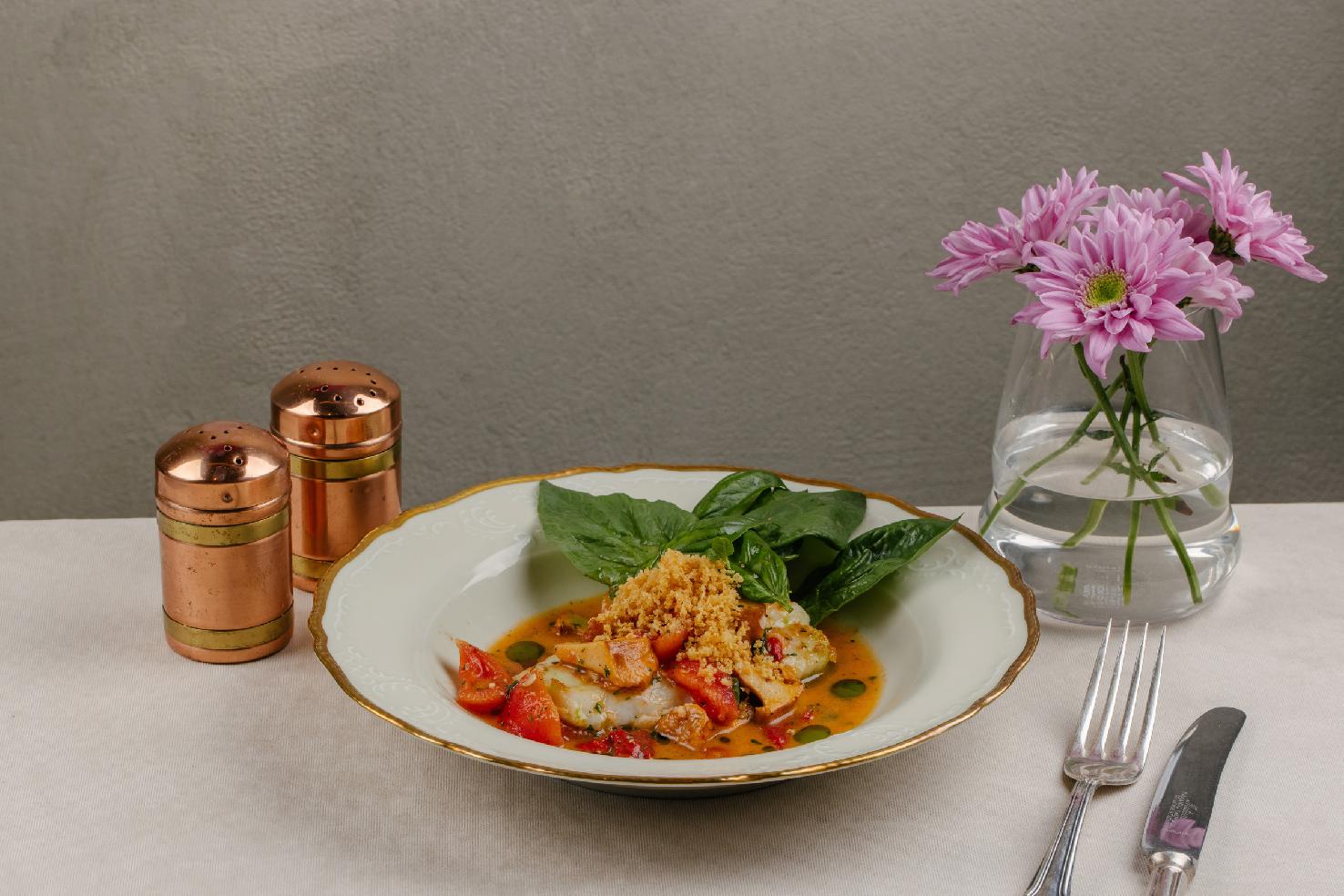 -Нежное филе трески мы приготовили в сочетании с картофельным пюре, грибами, розовыми томатами и соусом на основе все тех же сезонных грибов. Украшаем блюдо листьями шпината и базилика, капустой пакчой и пангритатой из подсушенной чиабатты, петрушки, чеснока и сока цитрусовых.