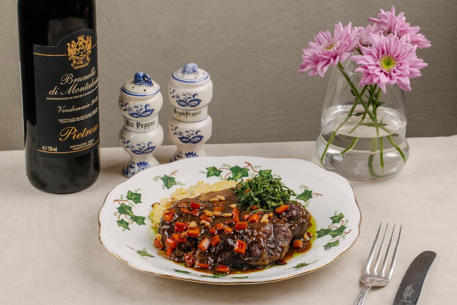 -Томленое с овощами, соусом демигляс и красным вином мясо оссобуко мы решили подать с нежной кукурузной полентой, соусом на основе томленых овощей и бульона, шпинатом и кедровым орехом. Вышла весьма нетривиальная и яркая интерпретация классического блюда севера Италии. Обязательно уделите внимание костному мозгу оссобуко - это настоящий деликатес!