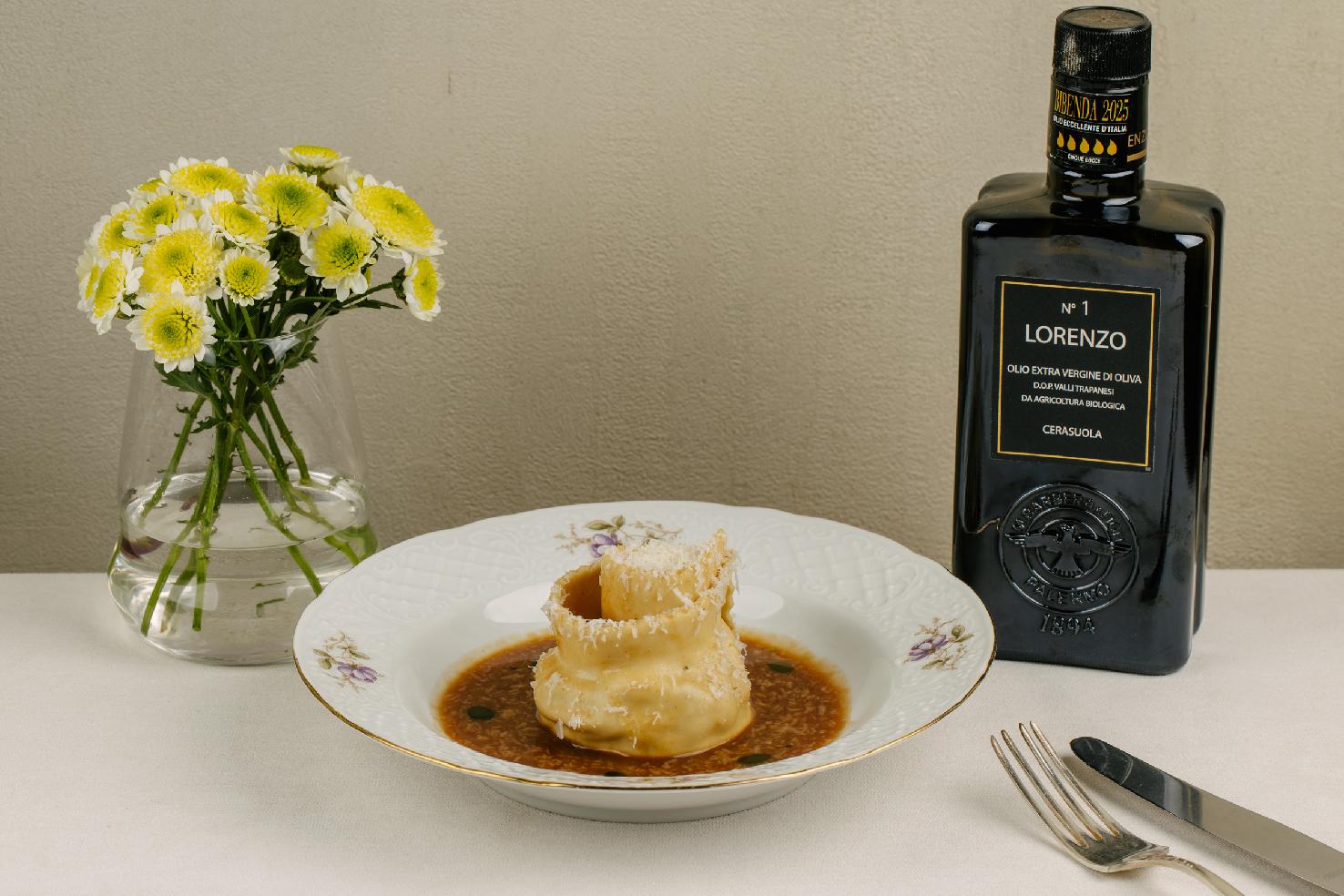 -Наши домашние равиоли ручной лепки с рубленой говядиной отруба пиканья мы подаем в соусе на основе сливочного масла, соуса демигляс, ворчестера, куриного бульона и чеснока. Равиоли вылеплена в виде розы: если вы забыли купить цветы на свидание, это ваш шанс!)