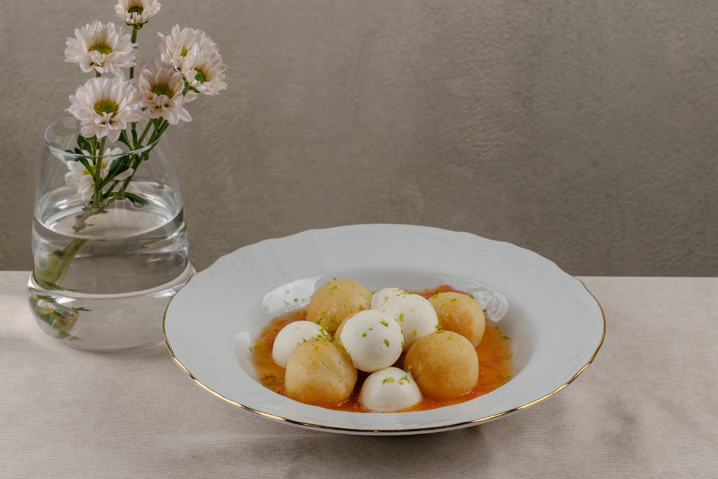 -Классическое дрожжевое тесто, пропитанное сиропом из нашего домашнего лимончелло. Сочетаем с сочным соусом на основе трех видов фреша: лимона, грейпфрута и апельсина, кремом ванильный шантильи и воздушным лимонным ганашем. Украшаем десерт сегментами грейпфрута и цедрой лайма.