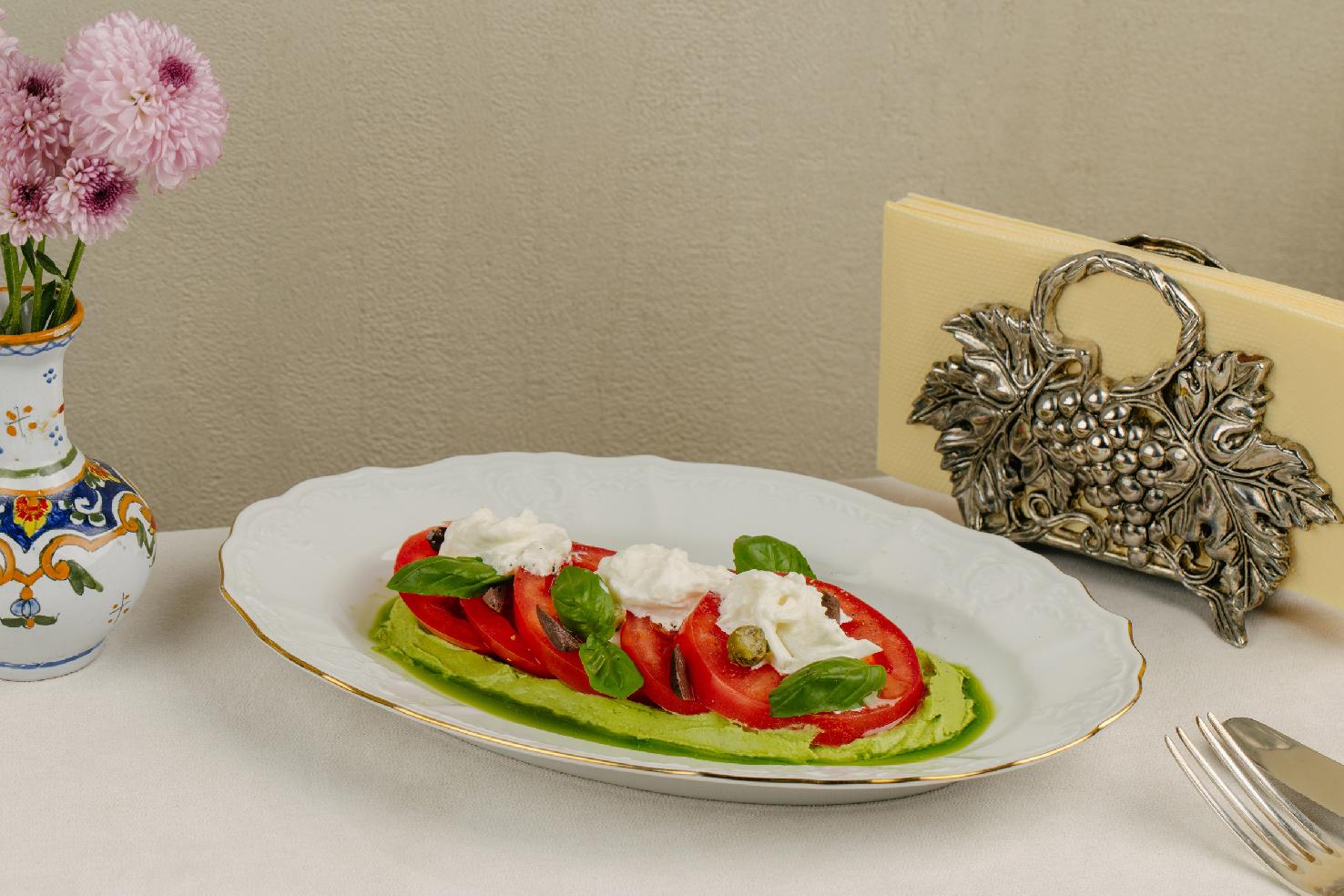Спелые сезонные томаты с каперсами и хрустящим луком мы подаем на нежном базиликовом креме. Незаурядное сочетание в идеально сбалансированной закуске.