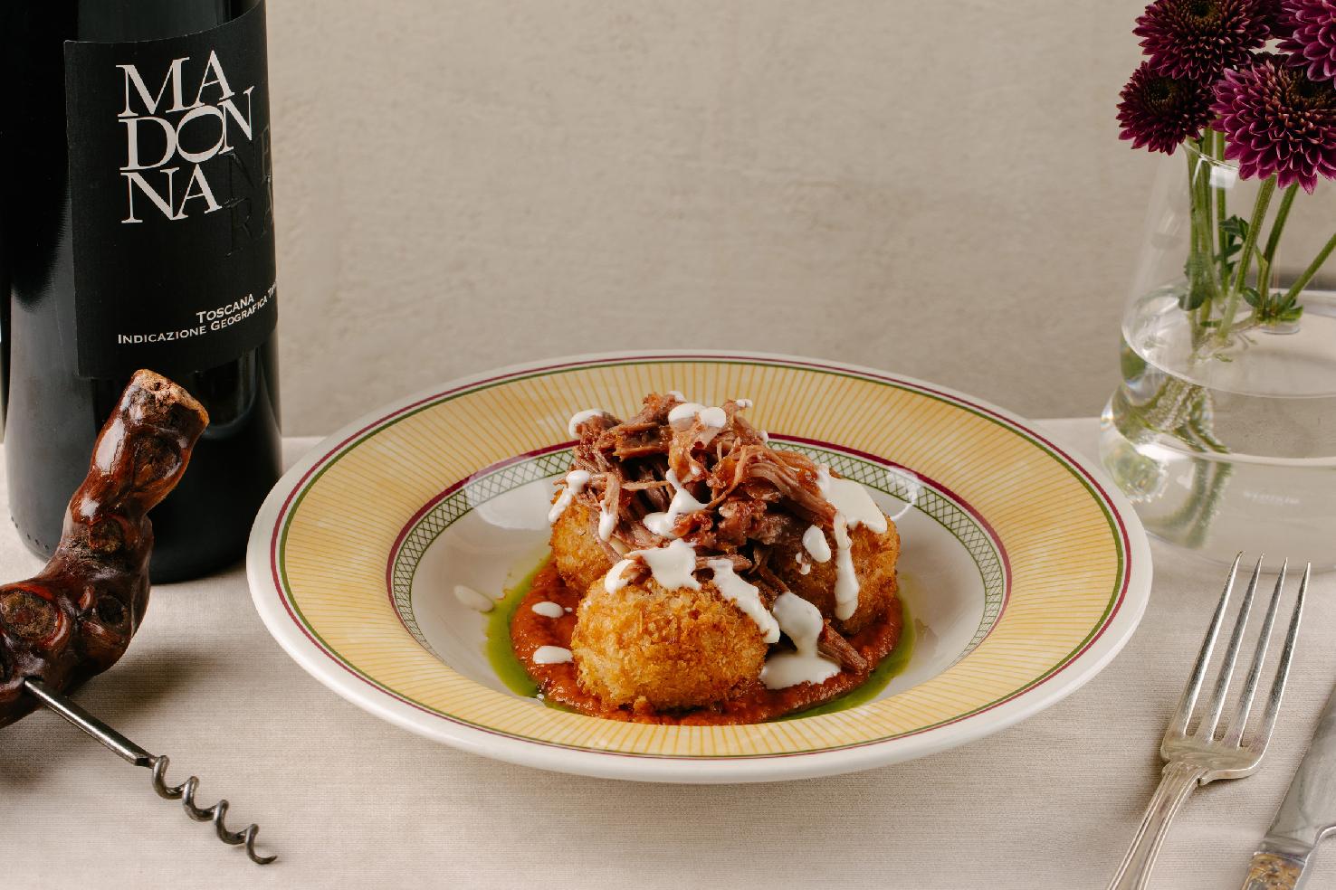 Горячая закуска из двух шариков аранчини. Хрустящие итальянские аранчини с фермерской тягучей моцареллой, пикантным соусом и томленым утиным мясом.